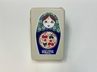 アイボリーの落ち着いた色の缶を、大人の雰囲気の青マトリョーシカシールでデコレーションした、手のひらサイズの詰合せ。7種類のチョコが1こずつ入っています。