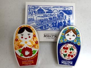 ロシアの民衆版画ルボークの作品をあしらった紙製化粧箱の中には、赤と青のマトリョーシカ化粧箱が1個ずつ入っています。季節のご挨拶などにお使い下さい。